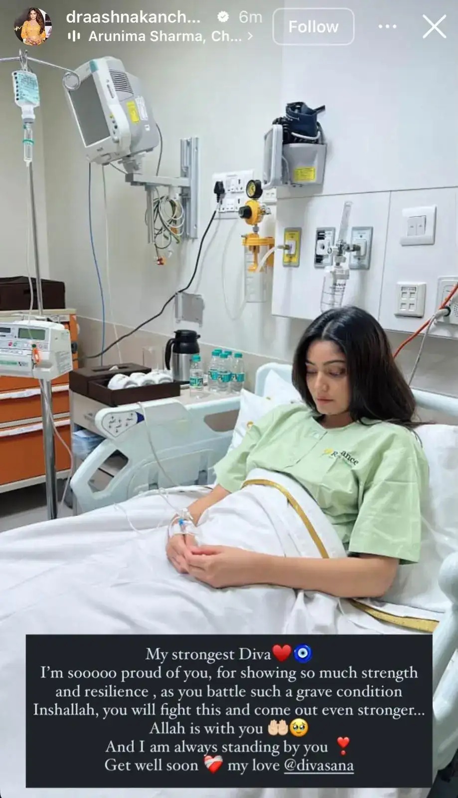 सना की दोस्त आशना ने यह अपडेट दिया है। आशना ने जो फोटो शेयर की है उसमें सना अस्पताल के बिस्तर पर बैठी हुई हैं और उन्हें ड्रिप लगी हुई है। फोटो के साथ आशना ने लिखा,"मेरी सबसे मजबूत दीवा। मुझे तुम पर बहुत गर्व है कि तुम इतनी गंभीर स्थिति से जूझते हुए इतनी ताकत और लचीलापन दिखा रही हो। इंशाल्लाह, तुम इससे लड़ोगी और और भी मजबूत होकर बाहर आओगी... अल्लाह तुम्हारे साथ है। और मैं हमेशा तुम्हारे साथ खड़ी हूं। जल्दी ठीक हो जाओ मेरा प्यार।