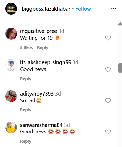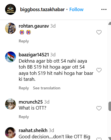 बिग बॉस से जुड़ी इस खबर के सोशल मीडिया पर फैलने के बाद एक यूजर ने लिखा, "सही है साल में 2 बार इस शो को देखकर बोरियत फील होती है"। दूसरे यूजर ने लिखा, "देख लेना अगर बिग बॉस ओटीटी सीजन 4 नहीं आया तो 19वां सीजन सुपरडुपर हिट होगा"। एक और अन्य यूजर ने लिखा, "इस बार होस्ट भी चेंज होना चाहिए, सलमा खान की जगह अक्षय कुमार को लेकर आना चाहिए"।