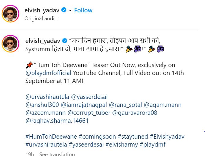 अब हाल ही में उन्होंने अपने आधिकारिक इंस्टाग्राम पर नई पोस्ट शेयर करते हुए बताया कि उनका ये पूरा गाना कब दर्शकों के सामने आएगा। इस पोस्ट को शेयर करते हुए एल्विश ने देसी अंदाज में कैप्शन लिखते हुए फैंस से तोहफा मांगा। उन्होंने लिखा, "जन्मदिन हमारा, तोहफा आप सभी को, सिस्टम हिला दो, गाना आया है हमारा"।