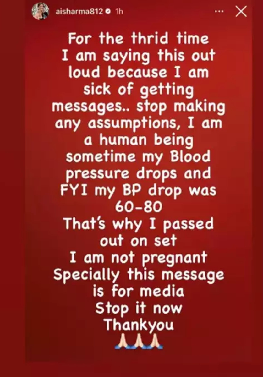 ऐश्वर्या शर्मा (Aishwarya Sharma) ने अब अपनी प्रेग्नेंसी की अफवाहों पर चुप्पी तोड़ते हुए अपने इंस्टाग्राम स्टोरी पर एक लंबा-चौड़ा पोस्ट लिखा- 'मैं तीसरी बार चिल्ला कर कह रही हूं, क्योंकि मैं मैसेज से तंग आ गई हूं। कोई भी कल्पना करना बंद करें, मैं एक इंसान हूं और कभी-कभी मेरा ब्लड प्रेशर भी गिर जाता है और आपकी जानकारी के लिए मेरा ब्लड प्रेशर 60-80 था। इसलिए मैं सेट पर बेहोश हो गई। मैं प्रेग्नेंट नहीं हूं। ये अफवाह अभी रोक दें।'