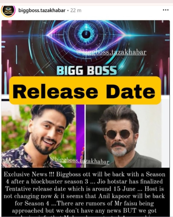 मालूम हो कि 15 जून को बिग बॉस ओटीटी 4 को ऑनलाइन स्ट्रीम किया जा सकता है। मशहूर ओटीटी प्लेटफॉर्म जियो हॉटस्टार पर इसे प्रीमियर किया जाएगा। ऐसे में जो बिग बॉस के दीवानों को और अधिक इंतजार नहीं करना पड़ेगा। हालांकि, शो के होस्ट को लेकर अभी भी पेंच फंसा हुआ है। दरअसल बिग बॉस ओटीटी का पहला सीजन फेमस फिल्ममेकर करण जौहर ने होस्ट किया था।