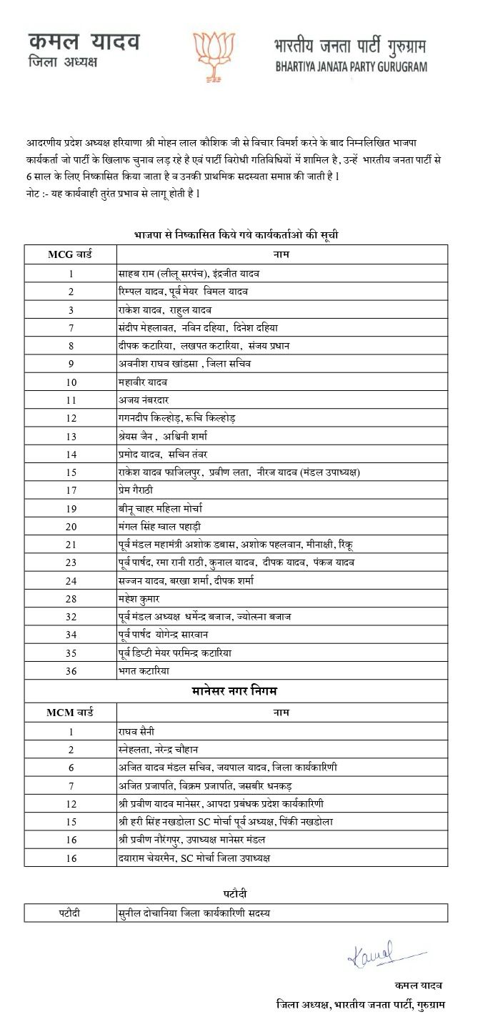भाजपा जिलाध्यक्ष कमल यादव ने पत्र के माध्यम से लिखा कि आदरणीय प्रदेश अध्यक्ष हरियाणा श्री मोहन लाल कोशिक जी से विचार विमर्श करने के बाद निम्नलिखित भाजपा कार्यकर्ता जो पार्टी के खिलाफ चुनाव लड़ रहे हैं एवं पार्टी विरोधी गतिविधियों में शामिल है, उन्हें भारतीय जनता पार्टी मे 6 साल के लिए निष्कासित किया जाता है व उनकी प्राथमिक सदस्यता समाप्त की जाती है।