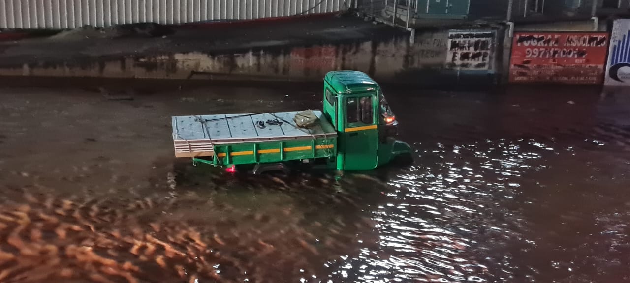 इफको चौक स्थित दिल्ली गुरुग्राम एक्सप्रेस की सर्विस लाइन पर हुए जल भराव में बंद हुआ ऑटो