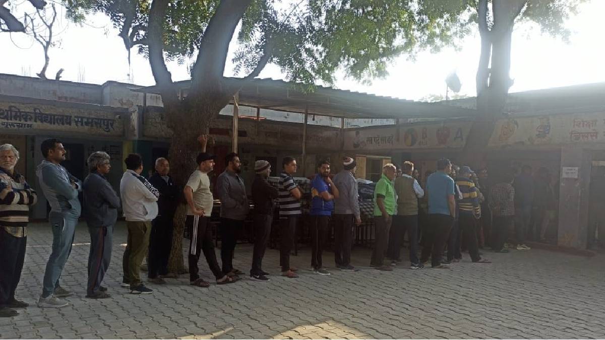 गुरुग्राम के गांव समसपुर के सरकारी स्कूल में बनाए गए बूथ पर लगी मतदाताओं की लंबी लाइन।