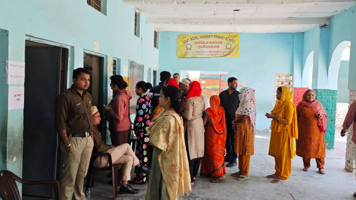 गुरुग्राम के शिवाजी नगर के गवर्नमेंट मॉडल संस्कृति प्राइमरी स्कूल में मतदान के लिए कतार में खड़े लोग।