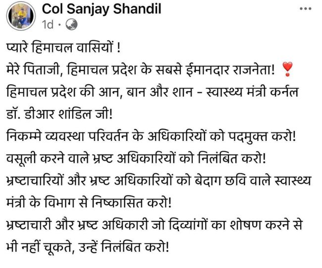 विवाद तब और गहरा गया जब मंत्री के बेटे कर्नल संजय शांडिल ने फेसबुक पर खुलकर नाराज़गी जताई। उन्होंने विभागीय अधिकारियों को निशाने पर लेते हुए कहा कि लापरवाही और गलतियों के कारण सरकार और नेताओं की छवि धूमिल हो रही है। संजय शांडिल ने यहां तक लिख दिया कि ऐसे भ्रष्ट और निष्क्रिय अधिकारियों को तुरंत बाहर का रास्ता दिखाया जाना चाहिए। उनकी इस टिप्पणी ने विपक्ष को बड़ा राजनीतिक हथियार थमा दिया है।