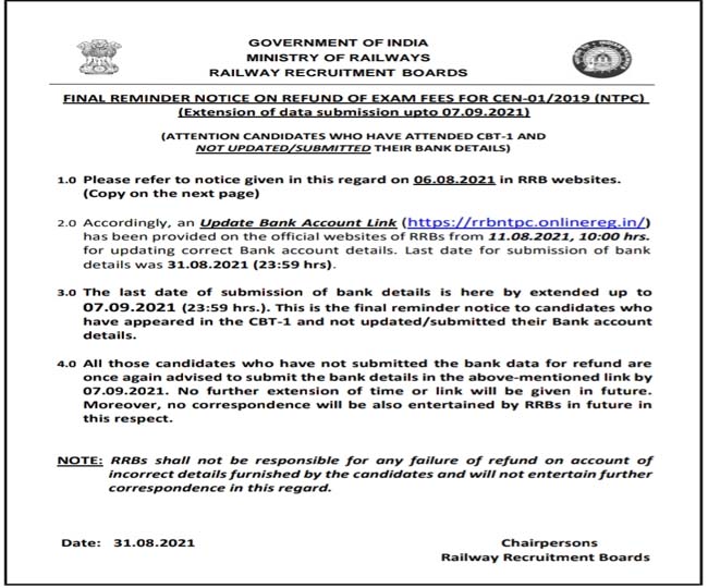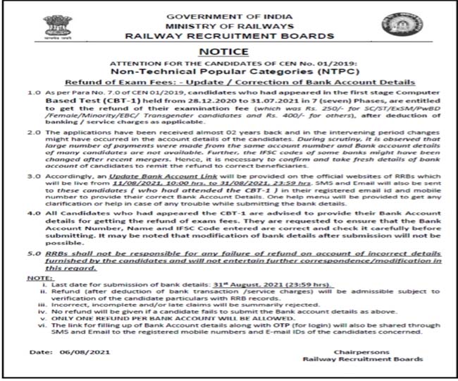 आरआरबी की ओर से नॉन टेक्निकल पॉपुलर कैटगरीज ( एनटीपीसी) परीक्षा का आयोजन 28 दिसंबर 2020 से 31 जुलाई 2021 तक अलग-अलग तिथियों में हुआ था। देशभर में आयोजित हुई परीक्षा में लाखों की संख्या में अभ्यर्थी शामिल हुए थे। उन अभ्यर्थियों में से सामान्य श्रेणी के अभ्यर्थियों से परीक्षा शुल्क के तौर पर ₹400 तथा एससी-एसटी, दिव्यांग और महिला अभ्यर्थियों से 250 रु लिए गए थे। परीक्षा खत्म होने के बाद शुल्क लौटाने की प्रक्रिया शुरू हुई। इस दौरान पाया गया कि चूंकि परीक्षा के लिए आवेदन लगभग 2 साल पहले लिए गए थे। इन 2 वर्षों में कई अभ्यर्थियों के बैंक अकाउंट बदल गए हैं, जिनकी संख्या काफी है। इसके मद्देनजर आरआरबी ने अभ्यर्थियों को यह मौका दिया उसकी वेबसाइट पर दिए गए लिंक में अपना नया बैंक अकाउंट शेयर करें ताकि परीक्षा शुल्क उनके खाते में भेज दिया जाए।