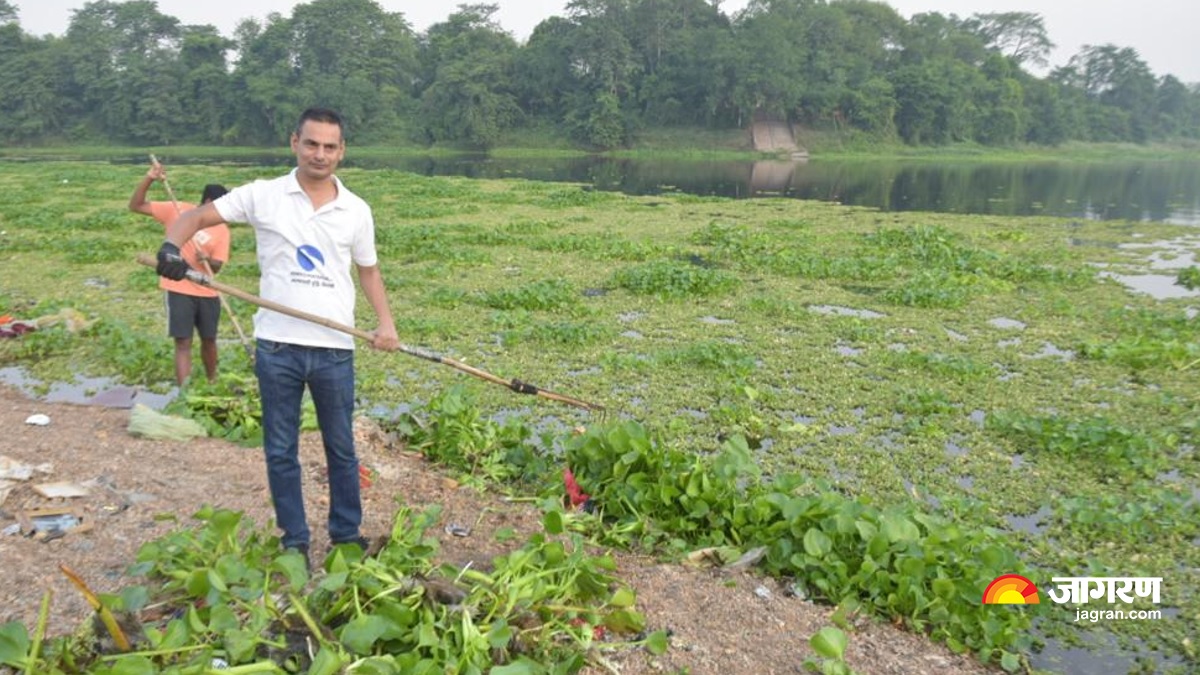 जमशेदपुर में स्वर्णरेखा नदी से जलकुंभी निकालते गौरव आनंद। फोटो- जागरण