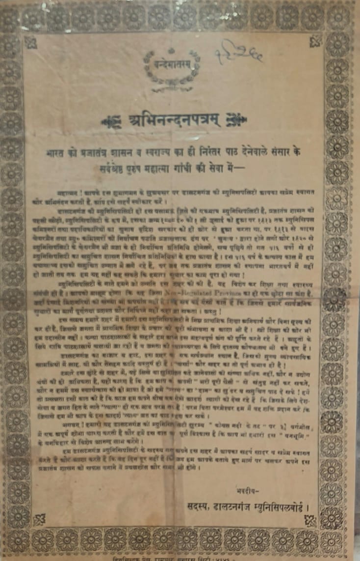 इसी दिन उन्होंने मारवाड़ी पुस्तकालय का अवलोकन किया था। इस दौरान उन्होंने पुस्तकालय के रजिस्टर पर पुस्तकालय के उज्जवल भविष्य की लिखित रूप में कामना की थी। तत्कालीन नागरिक मंच के स्व. जयवंश सहाय के पौत्र सह स्वतंत्रता सेनानी स्व. नीलकंठ सहाय के पुत्र अमित सहाय बताते हैं कि महात्मा गांधी के पलामू आगमन पर डालटनगंज म्यूनिसिपल बोर्ड ने अभिनंदन पत्र देकर सम्मानित किया था।