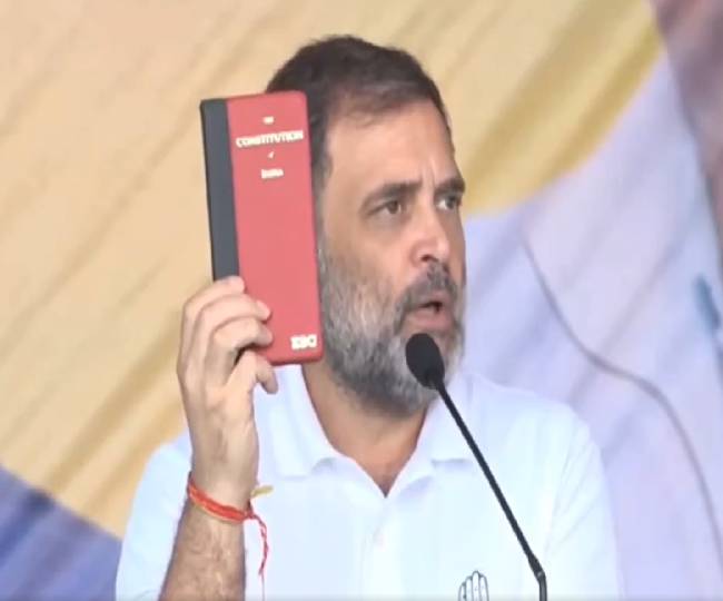 कांग्रेस नेता राहुल गांधी ने अपने संबोधन के दौरान सामने मौजूद लोगों को संविधान की किताब भी दिखाई।