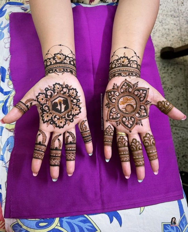 हाथों पर मिनिमल मेहंदी रचाने के लिए आप इस डिजाइन को भी फॉलो कर सकती हैं। फूलों की डिजाइन वाली इस मेहंदी को आप आसानी से अपने हाथों पर लगा सकती हैं और कम समय में अपनी खूबसूरती बढ़ा सकती हैं। साथ ही फूलों के बीच करवा चौथ की थाली और पति-पत्नी की तस्वीर इसे और भी खास बना देगी।
