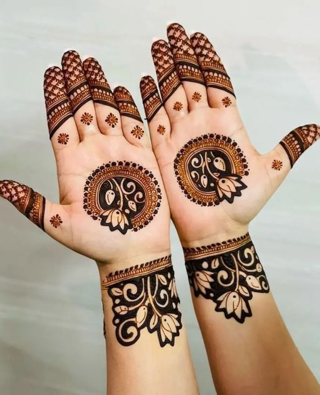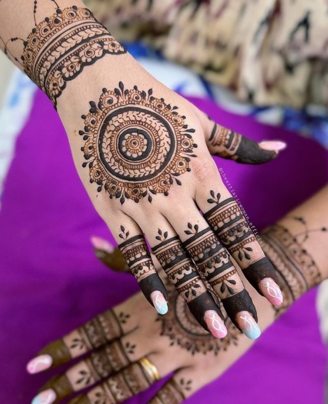 करवा चौथ के लिए बैक हैंड पर आप इस मेहंदी की डिजाइन को लगा सकती हैं। यह लगाने में काफी आसान है और कुछ ही मिनट में इसे बना सकते हैं। फूल और बेलों से बनी मेहंदी की यह डिजाइन इन दोनों काफी चलन में भी है और कई महिलाएं इसे लगाना पसंद भी करती है। ऐसे में इस करवा चौथ आप इस ट्रेंडी डिजाइन से अपनी खूबसूरती में चार चांद लगा सकती हैं।