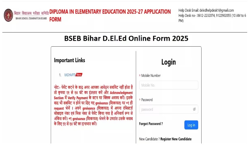 बिहार डीएलएड एप्लीकेशन फॉर्म 2025 केवल ऑनलाइन माध्यम से BSEB की ऑफिशियल वेबसाइट www.deledbihar.com पर जाकर भर सकते हैं। आपकी सहूलियत के लिए आवेदन की स्टेप्स एवं फॉर्म का डायरेक्ट लिंक इस पेज पर उपलब्ध करवाया जा रहा है, जिससे आप आसानी से फॉर्म भर सकते हैं।