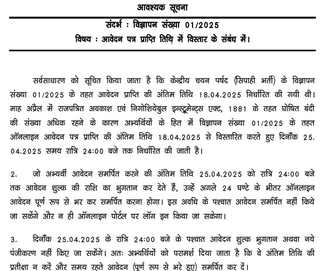 जॉब डेस्क, नई दिल्ली। सेंट्रल सेलेक्शन बोर्ड ऑफ कॉन्स्टेबल की ओर से पुलिस कॉन्स्टेबल भर्ती 2025 के लिए आवेदन की लास्ट डेट को 25 अप्रैल तक एक्सटेंड कर दिया गया है। ऐसे में जो अभ्यर्थी इस भर्ती में शामिल होना चाहते थे और किसी कारणवश तय तिथियों में फॉर्म नहीं भर सके थे उनके बस एक और मौका है। इच्छुक अभ्यर्थी इस भर्ती में भाग लेने के लिए तुरंत ही ऑनलाइन माध्यम से CSBC की ऑफिशियल वेबसाइट csbc.bih.nic.in पर जाकर या इस पेज पर उपलब्ध करवाए गए डायरेक्ट लिंक पर क्लिक करके भर सकते हैं।