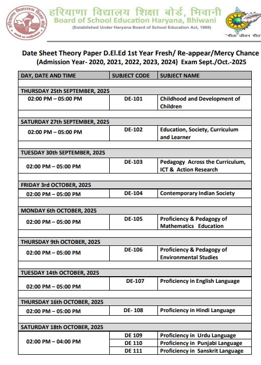 आपकी सहूलियत के लिए डेट एवं विषय के अनुसार इस पेज पर पूरा टाइम टेबल उपलब्ध करवाया जा रहा है जिससे आप आसानी से चेक कर सकते हैं कि किस सब्जेक्ट का पेपर किस तिथि में आयोजित होगा। हरियाणा बोर्ड डीएलएड 1st ईयर 25 सितंबर से 18 अक्टूबर 2025 तक और 2nd ईयर एग्जाम 26 सितंबर से 21 अक्टूबर 2025 तक आयोजित होंगे।