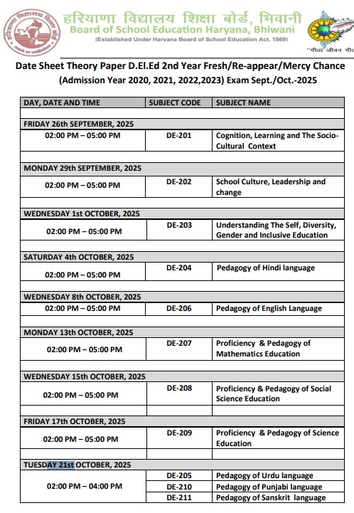 बोर्ड ऑफ स्कूल एजुकेशन हरियाणा (BSEH) की ओर से डीएलएड 1st एवं 2nd ईयर परीक्षा के लिए टाइम टेबल जारी कर दिया गया है। डेटशीट के मुताबिक 1st ईयर 25 सितंबर से 18 अक्टूबर 2025 तक और 2nd ईयर एग्जाम 26 सितंबर से 21 अक्टूबर 2025 तक एक शिफ्ट में संपन्न करवाए जायेंगे।