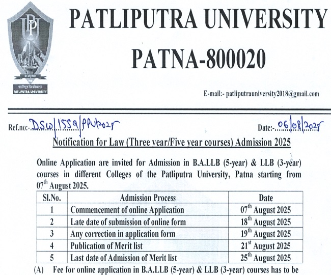 पाटलिपुत्र यूनिवर्सिटी में BA.LLB (5 वर्षीय) और LLB (3 वर्षीय) कोर्स में एडमिशन के लिए आवेदन प्रक्रिया स्टार्ट हो गई है जो 18 अगस्त तक जारी रहेगी। जो भी छात्र इन कोर्सेज में प्रवेश लेना चाहते हैं वे तय तिथियों के अंदर ऑनलाइन आवेदन कर सकते हैं। मेरिट लिस्ट 20 अगस्त 2025 को जारी की जाएगी।