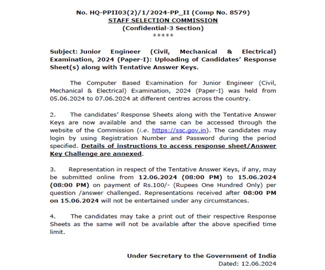 केंद्रीय विभागों में जूनियर इंजीनियर (सिविल मेकेनिकल और इलेक्ट्रिकल) के घोषित रिक्त पदों पर भर्ती के लिए निर्धारित चयन प्रक्रिया के अंतर्गत पहले चरण में आयोजित पेपर 1 लिखित परीक्षा के लिए अनौपचारिक उत्तर-कुंजियां (SSC JE Answer Key 2024) कर्मचारी चयन आयोग ने बुधवार 12 जून को जारी कर दी। आयोग ने उम्मीदवारों से उनकी आपत्तियों को 15 जून की शाम 8 बजे तक आमंत्रित किया है।