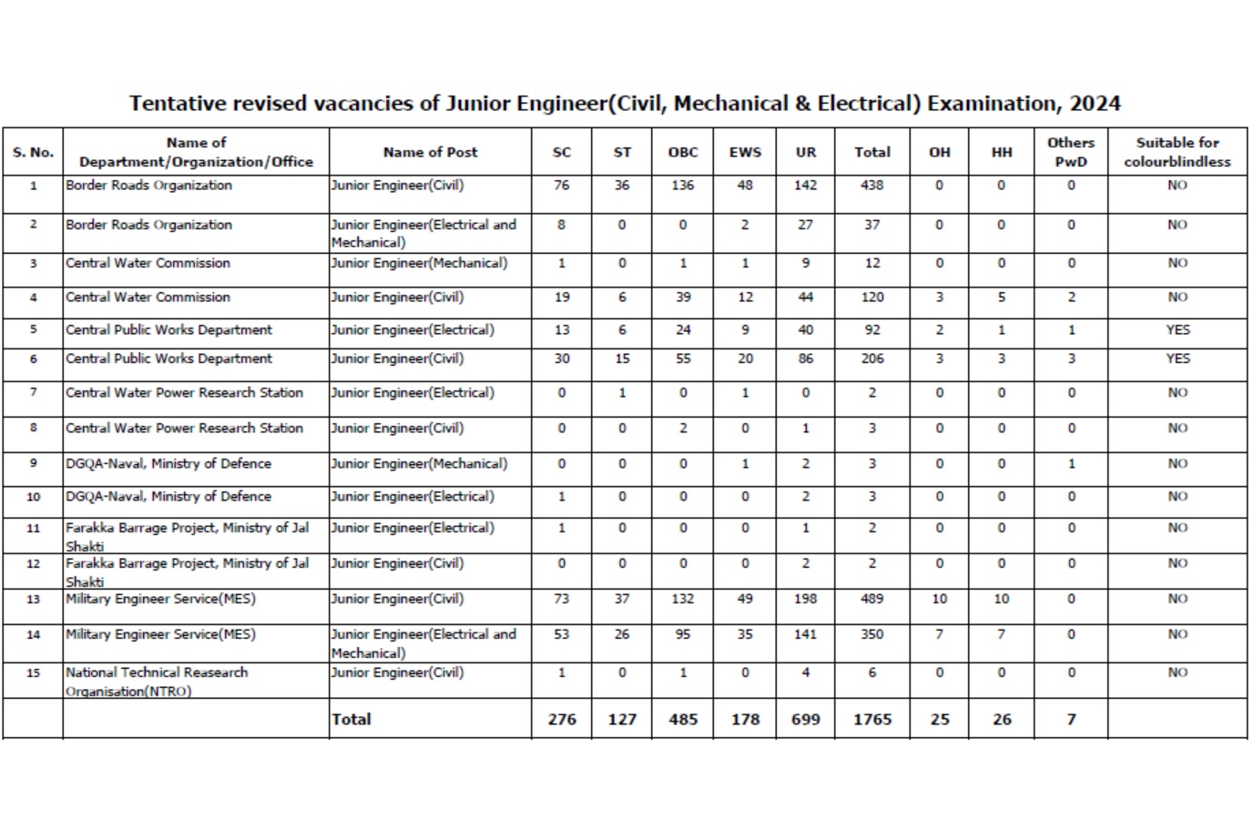 कर्मचारी चयन आयोग (SSC) ने मंगलवार 2 जुलाई को जारी अधिसूचना करके जूनियर इंजीनियर (सिविल इलेक्ट्रिकल और मेकेनिकल) परीक्षा 2024 के माध्यम से भरी जाने वाली रिक्तियों (SSC JE Exam 2024 Vacancies) की संख्या 966 से बढ़ाकर 1765 किए जाने की घोषणा की। अधिसूचना के मुताबिक सबसे अधिक 489 रिक्तियां मिलिट्री इंजीनियर सर्विस (MES) में जूनियर इंजीनियर (सिविल) की निकाली गई हैं।