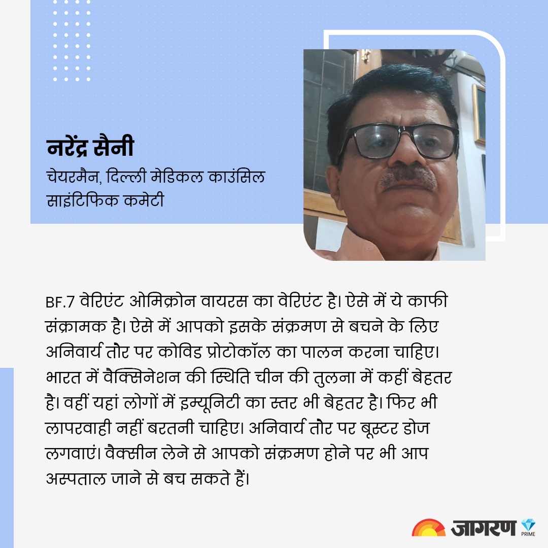 नई दिल्ली, विवेक तिवारी । कोविड के नए वेरिएंट BF.7 को लेकर भारत सहित पूरी दुनिया में चिंता है। भारत में भी बीते तीन दिनों में विदेश से आने वाले कुछ लोगों में ये वायरस मिला है। लोगों में इस वायरस को लेकर कई सवाल हैं। मसलन, क्या अभी तक लगाई गई वैक्सीन इस पर प्रभावी होंगी, क्या नई वैक्सीन लगवानी पड़ेगी, क्या ये डेल्टा वेरिएंट जितना घातक है, जिन लोगों को कोविड हो चुका है उनके लिए अधिक खतरा तो नहीं, ये सभी सवाल जागरण प्राइम ने देश के जाने माने विशेषज्ञों - कोविड वर्किंग ग्रुप के चेयरमैन डॉक्टर एनके अरोड़ा, इंडियन मेडिकल एसोसिएशन के अध्यक्ष डॉक्टर सहजानंद प्रसाद सिंह, एम्स गोरखपुर के डॉक्टर हीरालाल भल्ला, दिल्ली मेडिकल काउंसिल की साइंटिफिक कमेटी के चेयरमैन नरेंद्र सैनी, पद्मश्री डॉक्टर एम वली, लखनऊ स्थित केजीएमयू के डॉक्टर सुमित रूंगटा और जेएनयू के बायोटेक्नोलॉजी विभाग के प्रोफेसर रूपेश चतुर्वेदी से पूछे। विशेषज्ञों का मानना है कि लोगों को फिलहाल घबराने की नहीं, सतर्कता बरतने की जरूरत है। उन्होंने हिदायत दी कि कोविड से जुड़े प्रोटोकॉल का पालन जरूर करें। प्रोफेसर रूपेश चतुर्वेदी ने बताया कि BF.7 वेरिएंट बहुत घातक तो नहीं पर ये बहुत संक्रामक है। अगर इसका संक्रमण बहुत अधिक फैला तो वायरस म्यूटेट कर जाएगा। नया बनने वाला वायरस कितना घातक होगा, ये कोई नहीं जानता। आइए जानते हैं कोविड के नए वेरिएंट के बारे में विशेषज्ञ क्या कहते हैं-