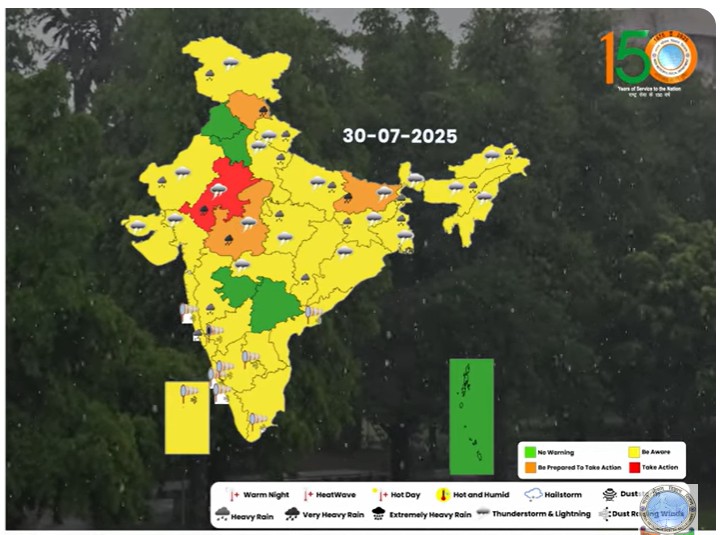 मौसम विभाग ने कई राज्यों में भारी बारिश की चेतावनी जारी की है राजस्थान में रेड अलर्ट है और 14 जिलों में स्कूल बंद हैं। बिहार हिमाचल प्रदेश और पश्चिमी मध्य प्रदेश के लिए ऑरेंज अलर्ट जारी किया गया है। उत्तर प्रदेश के 6 जिलों में भी तेज बारिश की संभावना है जबकि दिल्ली-एनसीआर में बादल छाए रहेंगे और हल्की बारिश हो सकती है।