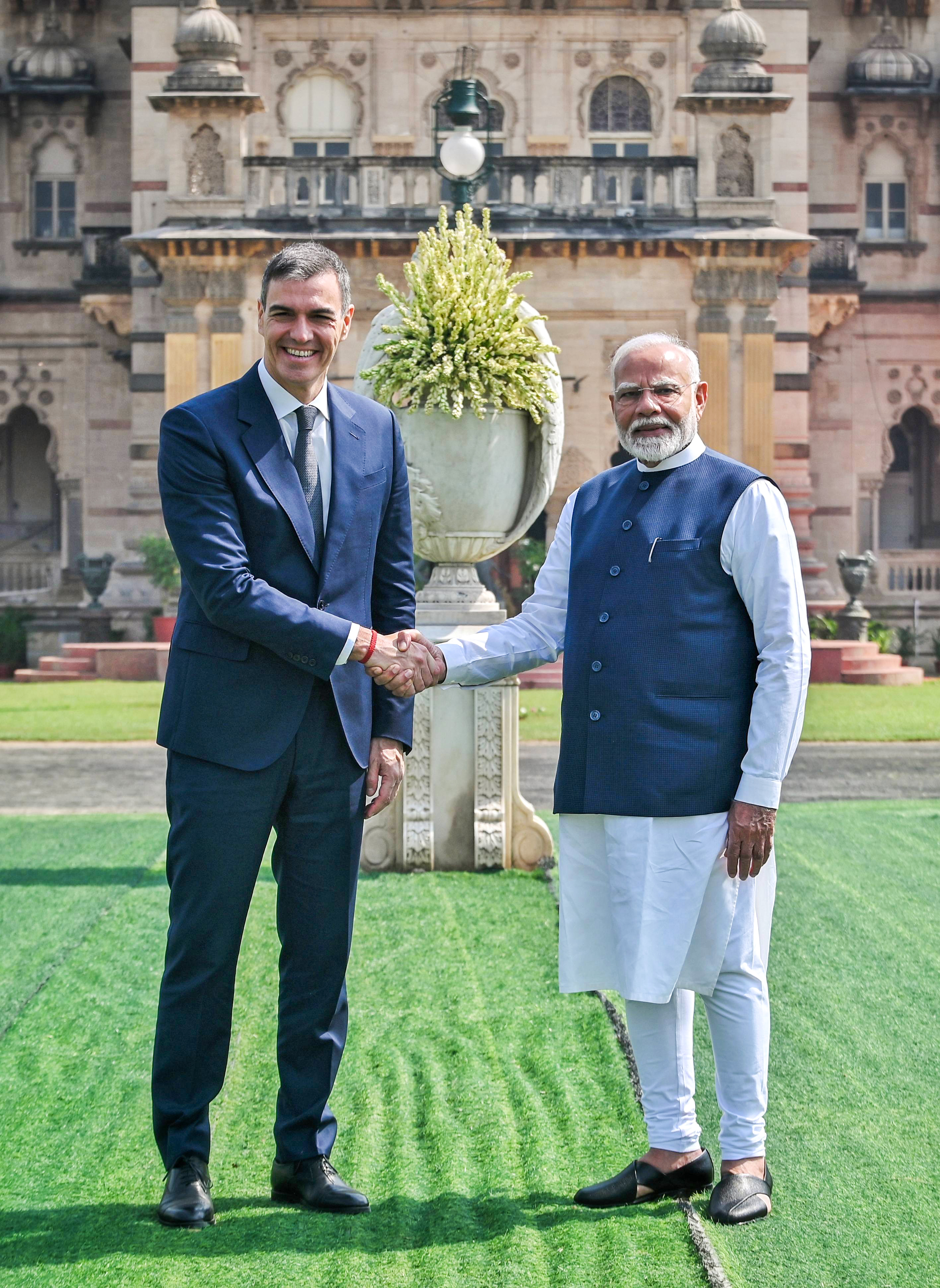 प्रधानमंत्री मोदी ने वडोदरा के लक्ष्मी विलास पैलेस में स्पेन के पीएम पेड्रो सांचेज से मुलाकात की। (Photo Source: ANI)