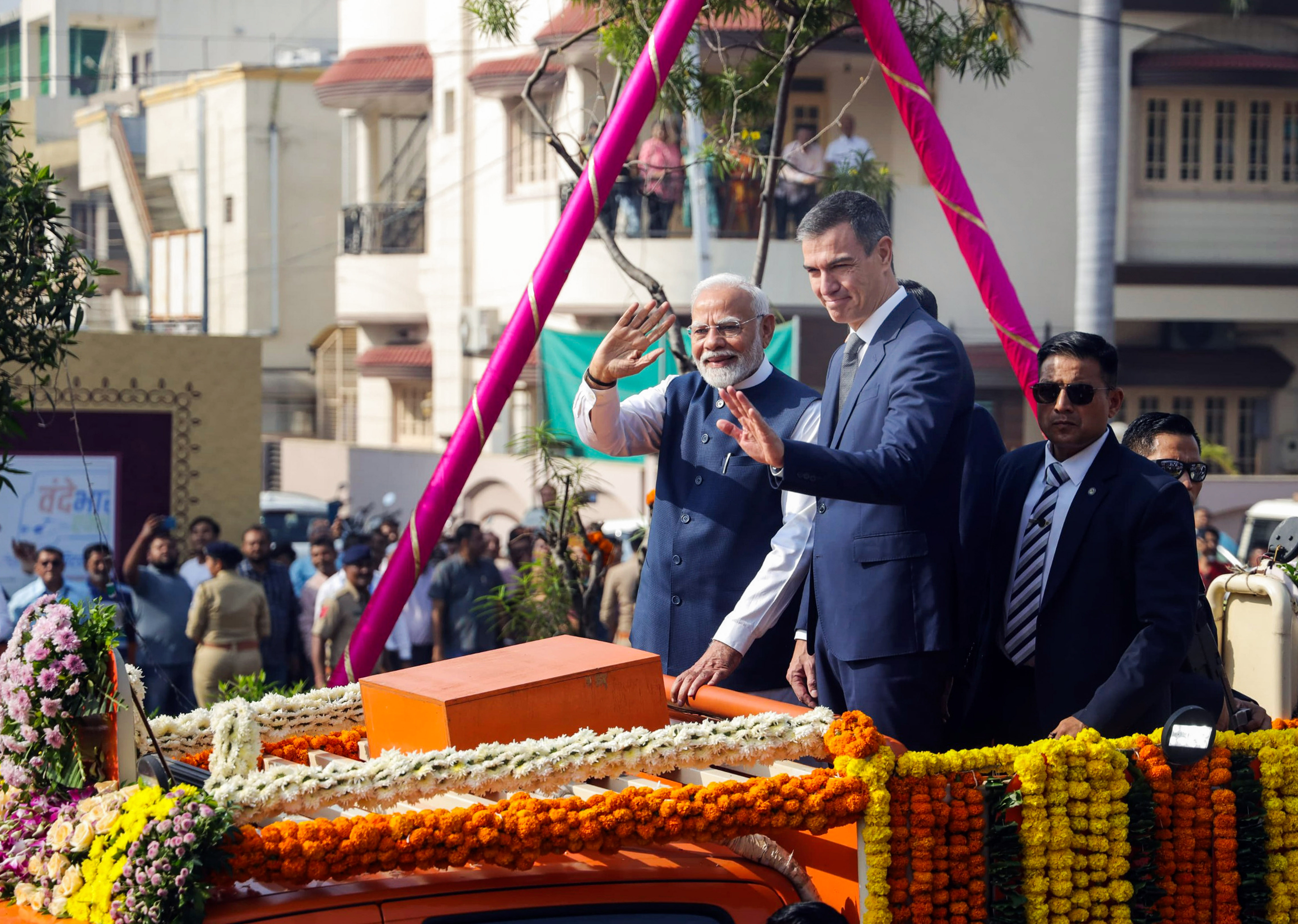वडोदरा में रोडशो में शामिल हुए प्रधानमंत्री मोदी और स्पेन के पीएम पेड्रो सांचेज। (एएनआई फोटो)