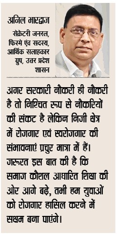 समाज को कौशल आधारित शिक्षा की ओर उन्मुख करने की है ताकि छात्रों को सही प्रकार की नौकरियों के लिए कुशल बनाया जाए। अगर सिर्फ सरकारी नौकरी को ही रोजगार मानना है तो ही संकट है वरना निजी क्षेत्र में अवसरों की कमी नहीं है, बस छात्रों और उनके माता-पिता को विभिन्न क्षेत्रों में उभरते हुए नौकरी के अवसरों से अवगत कराना और उन्हें उपयुक्त कौशल प्रदान करने वाले संस्थान का चयन करने में मदद करने की जरूर है। -अनिल भारद्वाज, सेक्रेटरी जनरल, फिस्मे एंव सदस्य, आर्थिक सलाहकार ग्रुप, उत्तर प्रदेश शासन