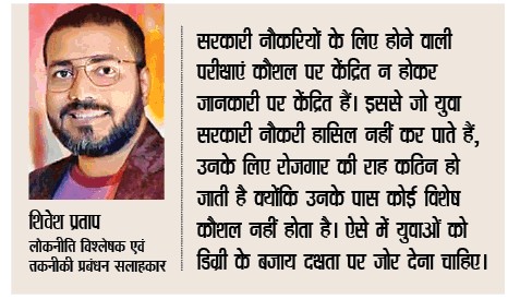 भारत में सरकारी नौकरी के लिए की जाने वाली तैयारी किसी कौशल विशेष पर केंद्रित न होकर सूचनाओं की जानकारी पर आधारित होता है। इसलिए तैयारी में फंसे विद्यार्थी बाजार की मांग के लिए अनुपयुक्त रह जाते हैं। सरकार यदि प्रतियोगी परीक्षाओं में कौशल आधारित विषयों की डाले तो बाजार आधारित कौशल विकास सुनिश्चित होगा। -शिवेश प्रताप, लोक नीति विश्लेषक एवं तकनीकी प्रबंधन सलाहकार