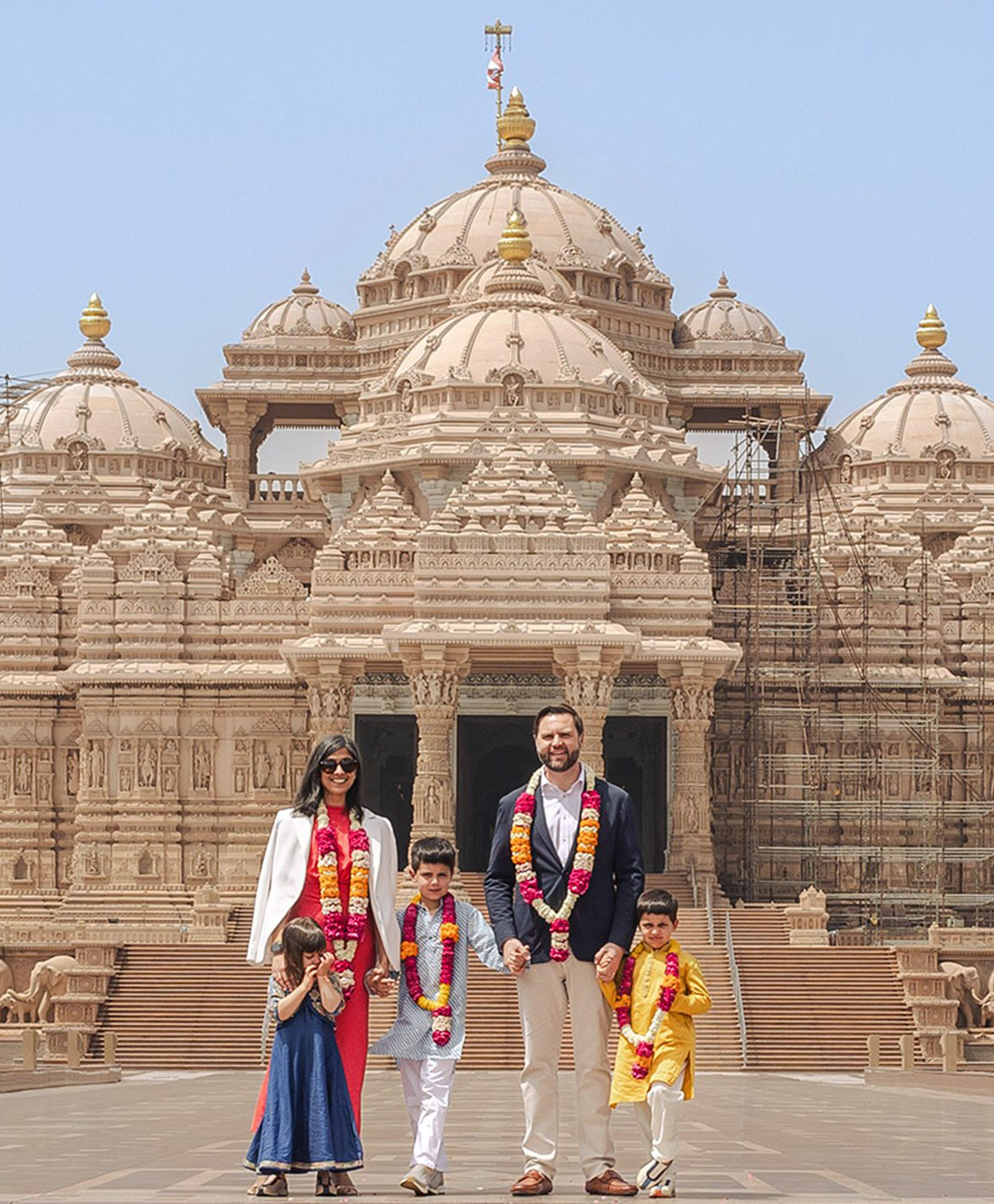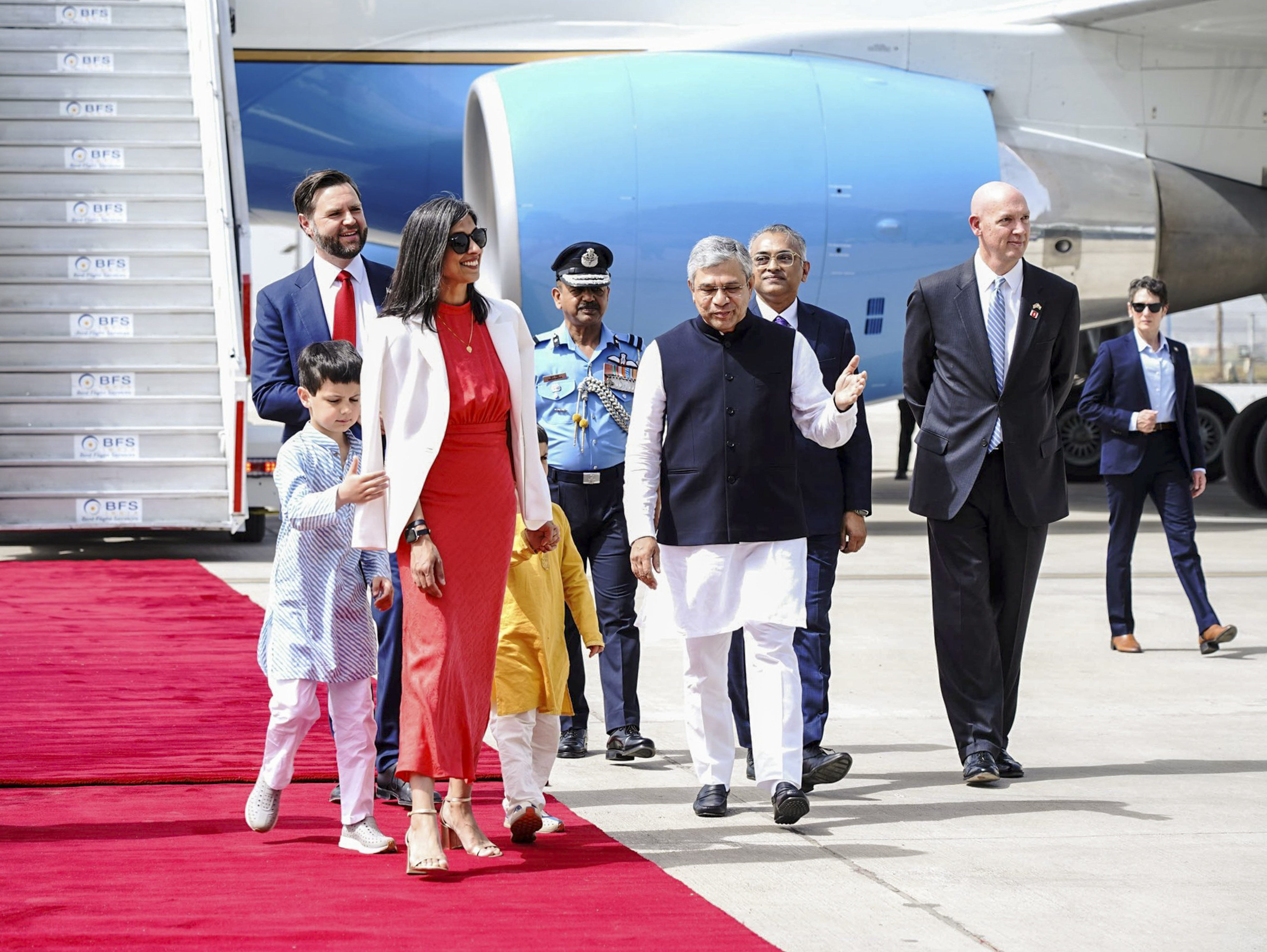 जेडी वेंस ने नेवी ब्लू रंग का सूट पहना हुआ है जबकि उषा रेड कलर की ड्रेस में नजर आई। उषा ने ड्रेस को वाइट ब्लेजर के साथ पेयर किया। भारत पहुंचने पर उनके बच्चों ने पारंपरिक भारतीय कपड़े पहने। लड़के कुर्ता पायजामा में और छोटी बच्ची अनारकली सूट में नजर आई। उनका यह पहनावा सोशल मीडिया पर वायरल हो रहा है।