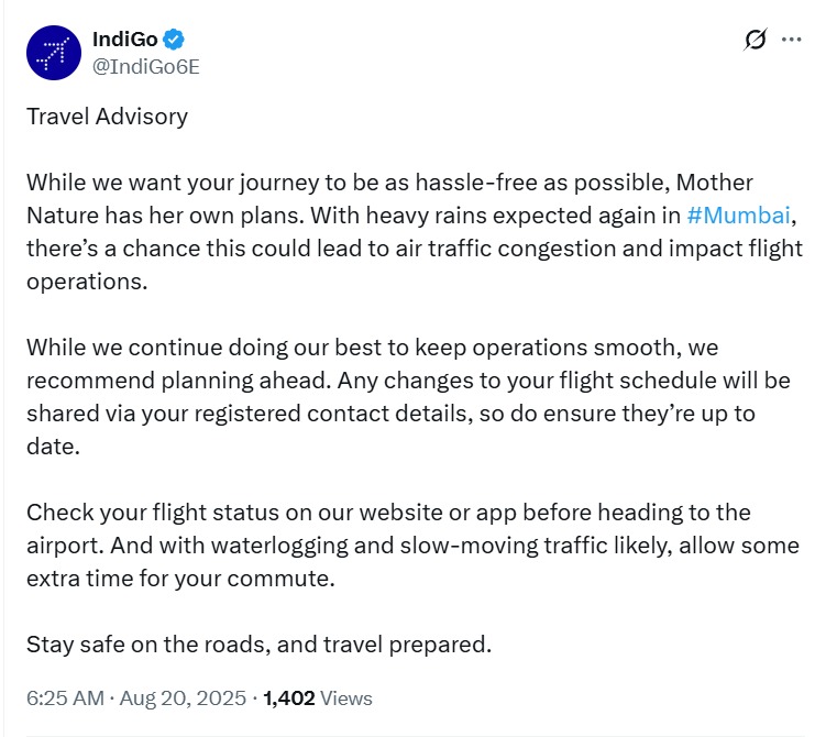 कंपनी चाहती है कि आपकी यात्रा बेफिक्र हो, लेकिन प्रकृति के अपने फैसले हैं। इंडिगो ने एडवायजरी में कहा है कि अपने फ्लाइट शेड्यूल की पहले से जांच करें और रास्ते में पानी जमा होने और ट्रैफिक की दिक्कत को ध्यान में रखें। अपने पास थोड़ा वक्त ज्यादा रखें, सावधानी बरतें और अपने रजिस्टर्ड कॉन्टैक्ट डिटेल्स अप-टू-डेट रखें ताकि कोई बदलाव की खबर आपको मिल जाए।