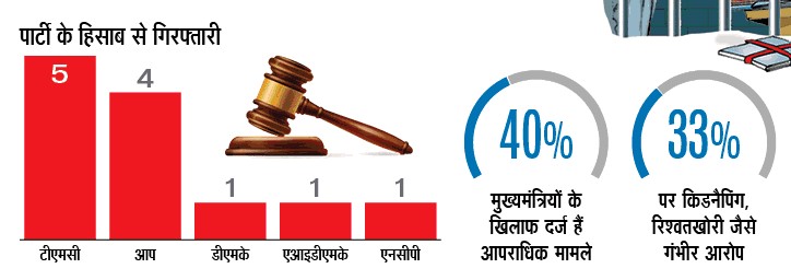 देश के 30 मुख्यमंत्रियों में से 12 यानी 40% मुख्यमंत्रियों के खिलाफ आपराधिक मामले दर्ज हैं। इनमें से 10 यानी 33 प्रतिशत पर हत्या की कोशिश, किडनैपिंग और रिश्वतखोरी जैसे गंभीर मामले हैं।