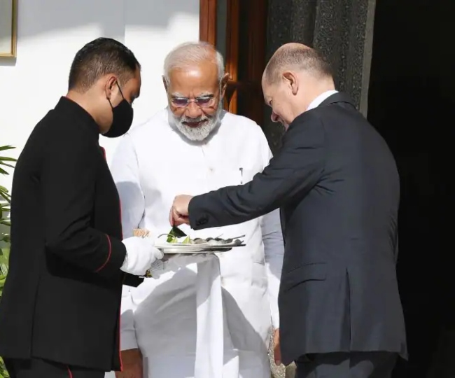 जर्मनी के चांसलर ओलाफ स्कोल्ज के साथ पीएम मोदी ने भारतीय पान का स्वाद चखा।