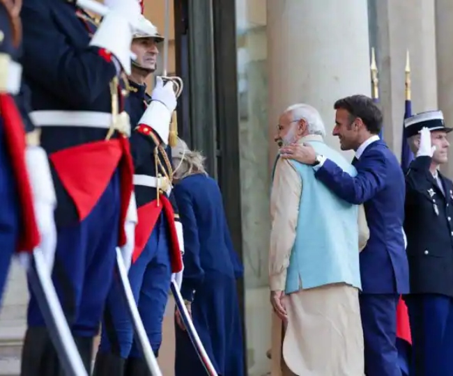 फ्रांस में बैस्टिल दिवस 2023 समारोह के दौरान फ्रांसीसी राष्ट्रपति इमैनुएल मैक्रॉन के साथ पीएम मोदी के कुछ पल।