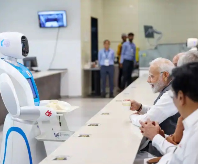 पीएम मोदी को अहमदाबाद के रोबोटिक पार्क में रोबोट द्वारा चाय परोसा गया था।