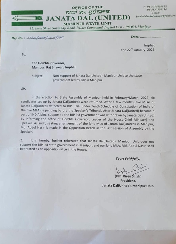 डिजिटल डेस्क, नई दिल्ली। मणिपुर में जनता दल (यूनाइटेड) ने भाजपा से समर्थन वापस ले लिया है। जेडीयू के एकमात्र विधायक मोहम्मद अब्दुल नासिर अब विपक्ष का हिस्सा होंगे। बता दें कि जेडीयू एनडीए घटक दल का महत्वपूर्ण हिस्सा है।
