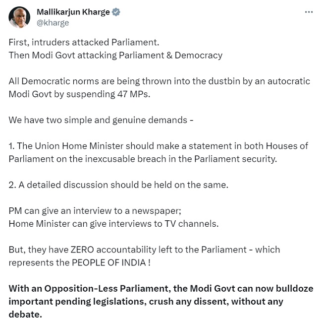 कांग्रेस अध्यक्ष और राज्यसभा में विपक्ष के नेता मल्लिकार्जुन खरगे ने केंद्र सरकार पर निशाना साधा। उन्होंने कहा कि सबसे पहले घुसपैठियों ने संसद पर हमला किया, फिर मोदी सरकार संसद और लोकतंत्र पर हमला कर रही है। निरंकुश सरकार द्वारा 47 सांसदों को निलंबित करके सभी लोकतांत्रिक मानदंडों को कूड़ेदान में फेंक दिया जा रहा है। विपक्ष-रहित संसद के साथ, मोदी सरकार अब महत्वपूर्ण लंबित कानूनों को कुचल सकती है, किसी भी असहमति को बिना किसी बहस के कुचल सकती है।