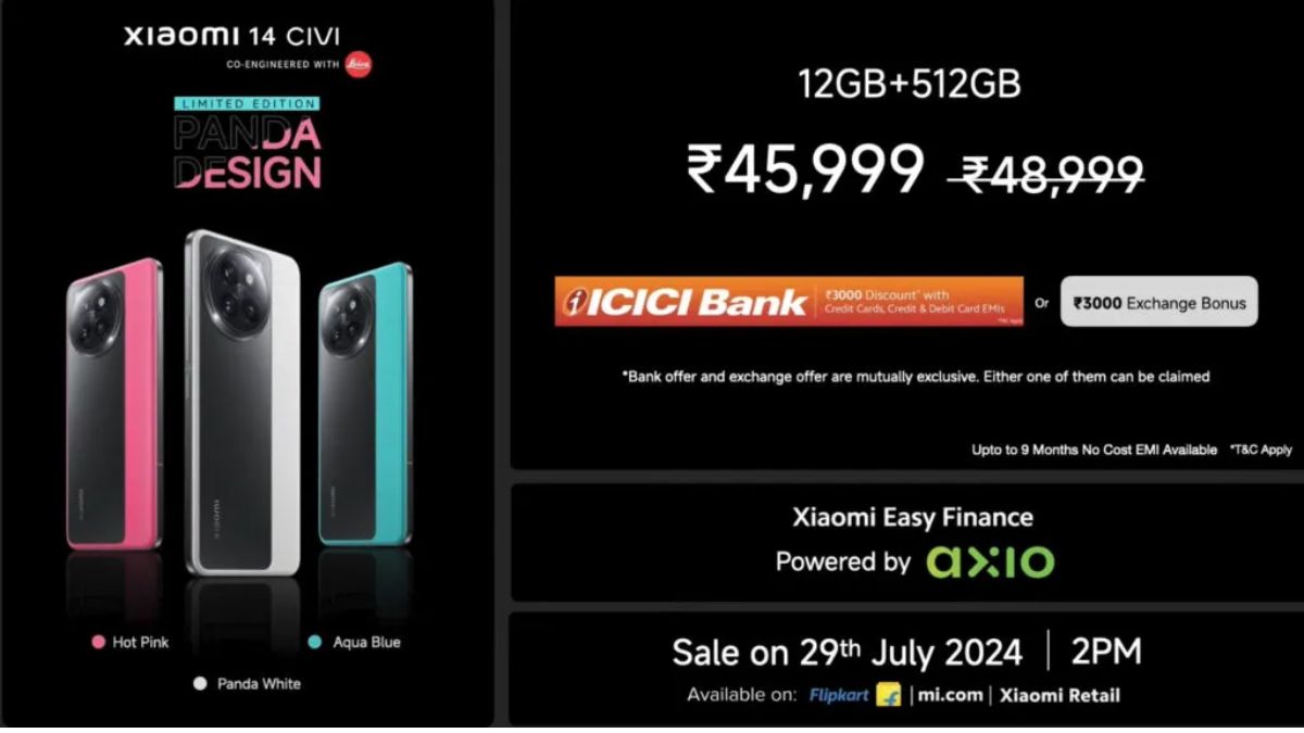 - भारत में Xiaomi 14 Civi Panda की कीमत सिंगल 12GB + 512GB स्टोरेज मॉडल के लिए 48,999 रुपये है। हैंडसेट हॉट पिंक, पांडा व्हाइट और एक्वा ब्लू कलर में आता है।