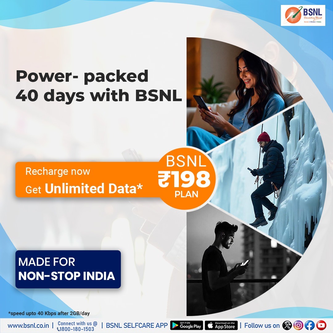 दरअसल, बीएसएनएल ने हाल ही में अपने X अकाउंट पर एक पोस्ट शेयर करते हुए इस नए प्लान की जानकारी दी है। पोस्ट में बताया गया है कि बीएसएनएल के ₹198 प्लान के साथ बिना रुके जुड़े रहें! इस प्लान में आपको 40 दिनों तक अनलिमिटेड डेटा मिलेगा। बिना किसी रुकावट के इंटरनेट और बेजोड़ वैल्यू के साथ अपने प्रीपेड एक्सपीरियंस को अपग्रेड करें।