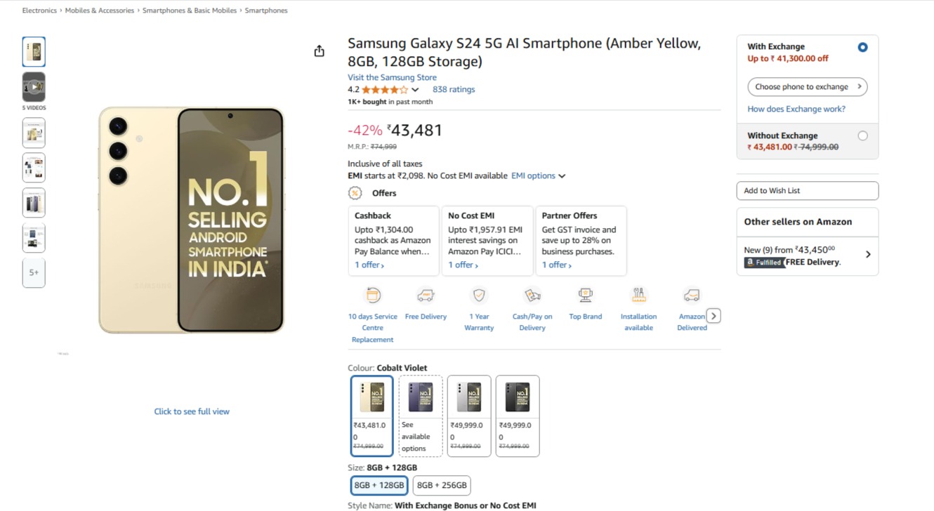 सैमसंग गैलेक्सी एस24 5जी पर अमेजन द्वारा शानदार डिस्काउंट दिया जा रहा है। यह फोन जिसकी वास्तविक कीमत 64999 रुपये है अमेजन पर बिना किसी ऑफर के 43481 रुपये में उपलब्ध है यानी 21518 रुपये की सीधी छूट। इस फोन पर बैंक और एक्सचेंज ऑफर भी उपलब्ध हैं जिससे कीमत और भी कम हो सकती है।