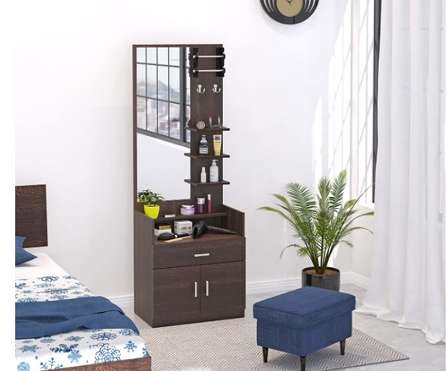 यह Dressing Table लकड़ी की बनी है। साथ ही इसका डिज़ाइन काफी स्टाइलिश और सुंदर है। यह शेल्फ, बैंगल होल्डर और हुक के साथ आती है। BLUEWUD Dressing Table Price: Rs 11649.