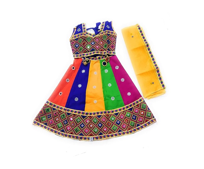 जब बेटे कृष्ण भगवान का रूप ले रहे हैं तो बेटियां भी तो राधा रानी के रूप से कम नहीं। तो इस जन्माष्टमी अपने बेटी को भी इस पोशाक को पहना कर खूबसूरत बनाएं। यह पहन कर आपकी बेटी राधा मैया का रूप लगेगी। यह एक लेहेंगा चोली है जो की बनारसी स्टाइल में आती है। इस पर काफी अच्छी कढ़ाई की गई है और इसका मल्टी कलर कॉम्बिनेशन काफी डिमांड में है।