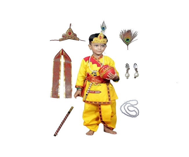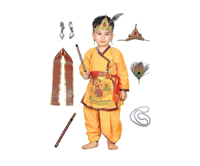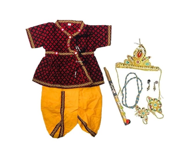 यह सेट ऑफ 7 हैं जिसमें महरून रंग का कुर्ता मिल रहा है, पीले रंग की धोती और कुछ एक्सेसरीज मिल रहीं हैं। इसमें 1 बांसुरी, बांधनी पटका, मोर पंख और मुकुट मिल रहा है जो आपके बच्चे को बल्कुल श्री कृष्ण की छवी देगा। इसका डिजाइन और पैटर्न यूनिक और अच्छा है। Dress Price: Rs 439.