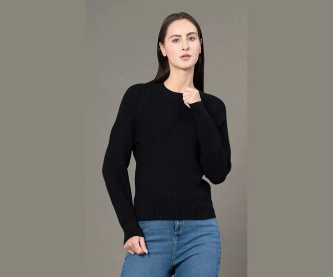 इस स्वेटर का नेक गोल शेप का है और फुल ब्लैक कलर में है। बाजू फूल है और उसपर सेम प्रिंटिंग वर्क मिलेगा। इसे आप किसी भी पेंट या जींस के साथ वियर कर सकती है। Redtape Women Sweater Price: Rs 1632.