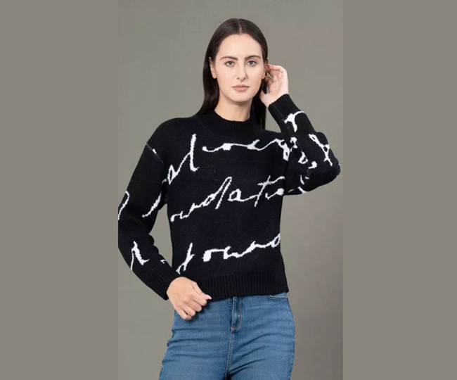 इस ब्लैक कलर के स्वेटर में व्हाइट कलर से प्रिंटिंग का काम किया गया है, जो काफी सुंदर और आकर्षक लुक दे रहा है। इसकी कीमत आपको ऑनलाइन काफी कम पड़ेगी।