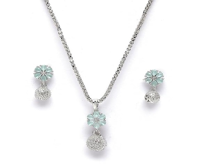 इसमें रोडियम-प्लेटेड सिल्वर टोन्ड पेंडेंट है जो काफी यूनिक दिखता है, इसे कम्फर्ट के साथ पहन सकते हैं, इसमें चुभने जैसी दिक्कत भी नहीं होती है। यह सेट एकदम स्किन फ्रेंडली है जिसे पहनने से दाने या रेश होने का भी कोई डर नहीं रहता है। इस डिजाइन के कई कलर ऑप्शन आपके लिए उपलब्ध हैं। ZENEME Jewellery Price: Rs 348.