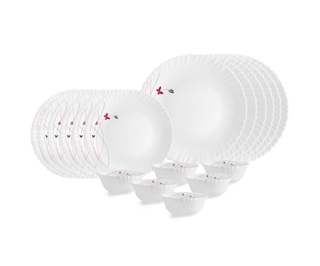 मजबूत ओपलवेयर ग्लास चिप रेजिस्टेंट भी है, इसलिए यह रोजाना इस्तेमाल में भी बेस्ट रहेगा। इस डैजल सीरीज में रैड और ब्लैक रंग के सुंदर टेंड्रिल्स हैं जो इस व्हाइट डिनर सेट को शानदार लुक देते हैं। यह सेट बोन ऐस फ्री है जो आपके परिवार के लिए स्वस्थ और सुरक्षित ऑप्शन देता है। Cello Opalware Dinner Set Price: Rs 1,169.