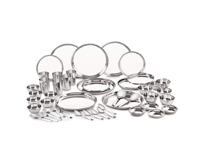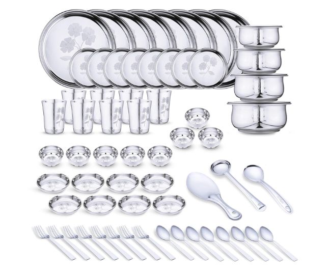 इस बेस्ट डिनर सेट फॉर होम को स्टेनलेस स्टील से बनाया गया है जो काफी बेहतरीन क्वालिटी के मटेरियल से बनाया गया है। सिल्वर रंग का यह क्रॉकरी सेट वजन में काफी हल्का है जिसकी वजह से इसका इस्तेमाल आप रोजाना कर सकती हैं। ये डिनर सेट भारतीय घरों की पहली पसंद है। इस सेट में खाना पकाने और परोसने के लिए भी सामान दिया गया है।
