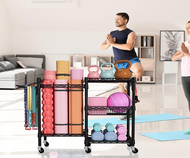 इस कॉम्पैक्ट और पोर्टेबल होम जिम स्टोरेज रैक का इस्तेमाल योग मैट, फोम रोलर्स, योग बोल्स्टर, योग बॉल और ब्लॉक, डम्बल, केटलबेल, बैंड, योग स्ट्रिप, योग व्हील और हुला हुप्स के लिए किया जा सकता है। फुटसी स्टोरेज Price: 21,457 रुपए.