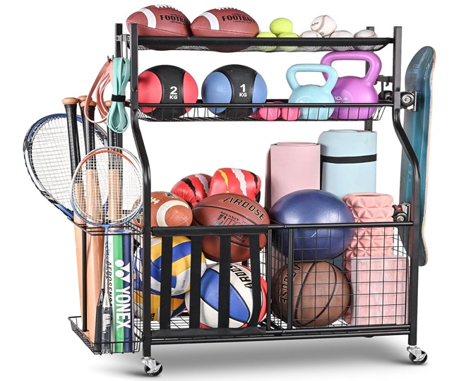 यह एक मल्टीफ़ंक्शनल स्पोर्ट्स रैक है, जिसमें 2 स्टोरेज बिन और 1 वायर मेश बास्केट के साथ-साथ 1 टियर बॉल रैक है। इसमें बास्केटबॉल, बेसबॉल और वॉलीबॉल आदि जैसे सभी प्रकार के स्पोर्ट्स गियर रखे जा सकते हैं। इसके अलावा यह चलने योग्य हुक के साथ आता है और आप इसमें अपने हेलमेट और स्कूटर भी लटका सकते हैं।